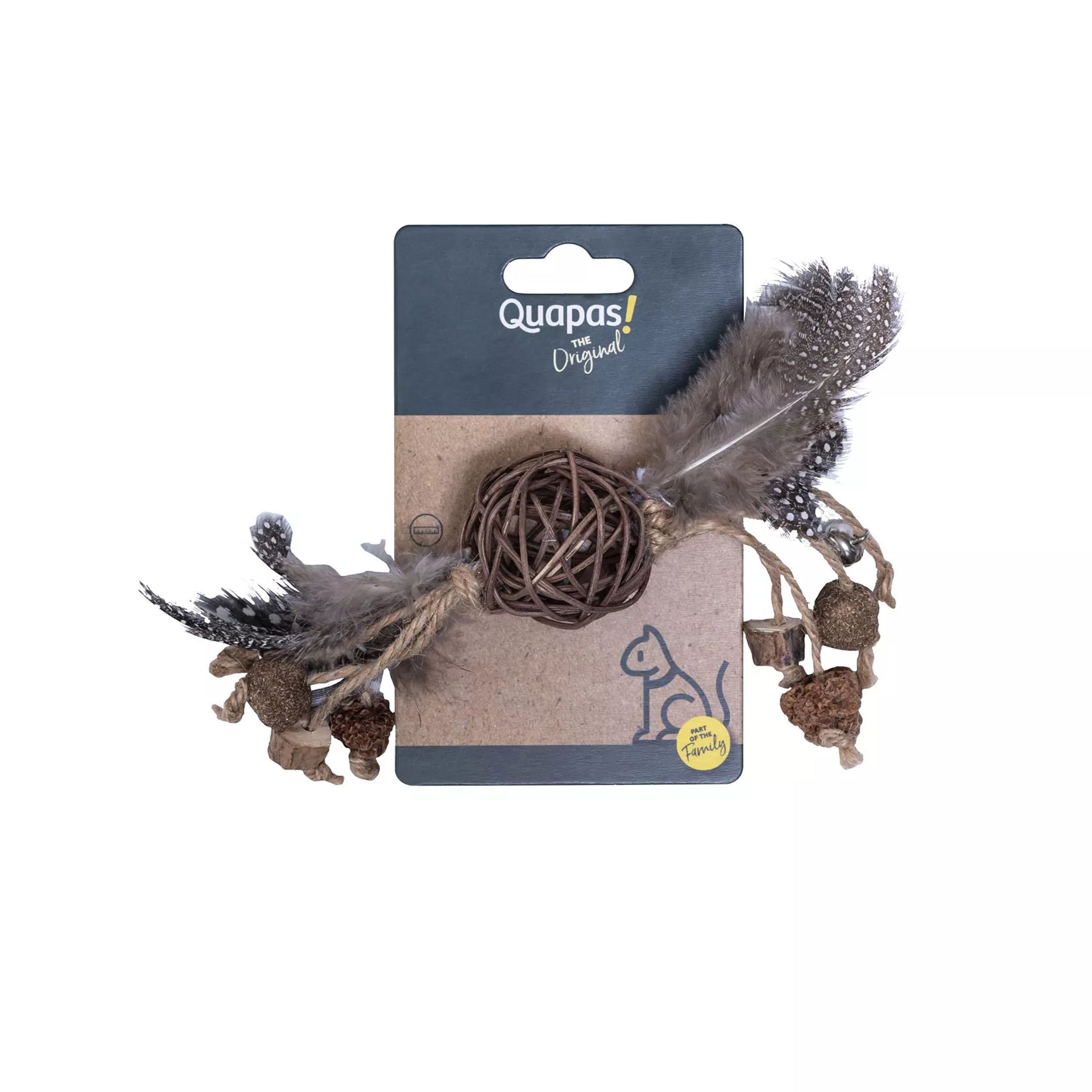 De Quapas! Rotan Bal met veertjes is een speels en natuurlijk kattenspeeltje dat uitnodigt tot urenlang vermaak. De combinatie van rotan, veertjes en touwtjes zorgt voor verschillende structuren die de nieuwsgierigheid van uw kat prikkelen en het natuurlijke jachtinstinct stimuleren. Dankzij het lichte formaat is het speeltje ideaal om te slaan, rollen, achtervolgen en mee te spelen.