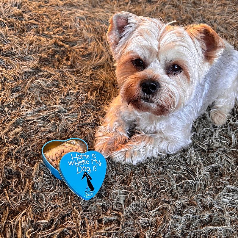 Sanal Hartenblik Home Is Where My Dog Is bestaat uit een decoratief hartvormig bewaarblik met hondensnacks